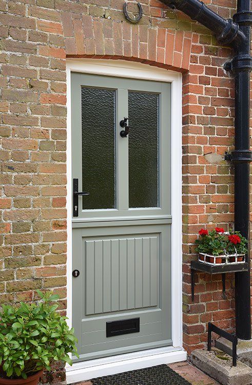 - Thorncliffe stable door in Tent Grey with Off White frame, featuring Black Kirkpatrick handle and letter box, along with a Doctor’s door knocker and Kathedral patterned glass.