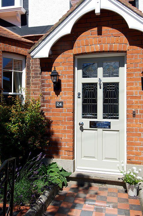 The front door is a Frenchay design finished in French Grey externally, and White internally. It also features chrome ironmongery including a Samuel Heath letter plate. The glass design is a bespoke recreation of the original design from their previous front door.