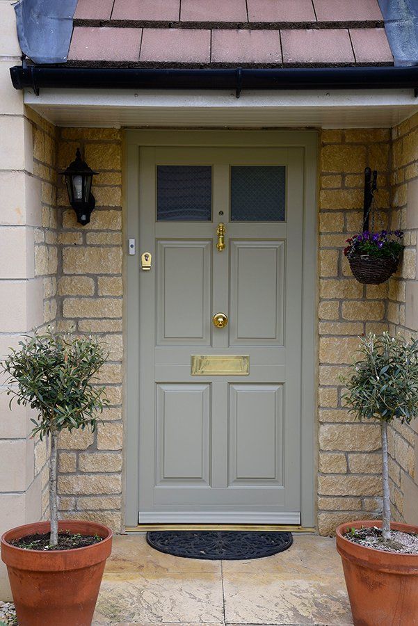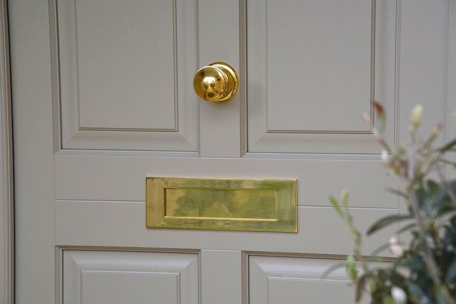 Chalfont front door in ‘French Grey’ with Polished Brass Samuel Heath Medium Sized letter plate and escutcheon as well as a Doctor’s knocker, small door knob and spyhole with Etched Star glass design, and manufactured in Engineered European Redwood.